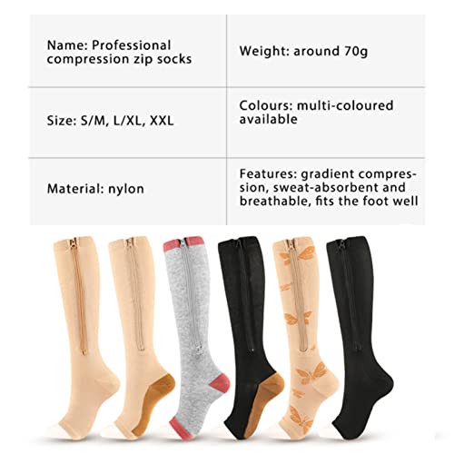 • Package Includes: There are 3 pairs 20-30 mmhg zipper compression socks in the package, which are sufficient to meet your daily use and replacement These compression stockings with zipper( Open Toe) or no zipper are suitable for both men and women.