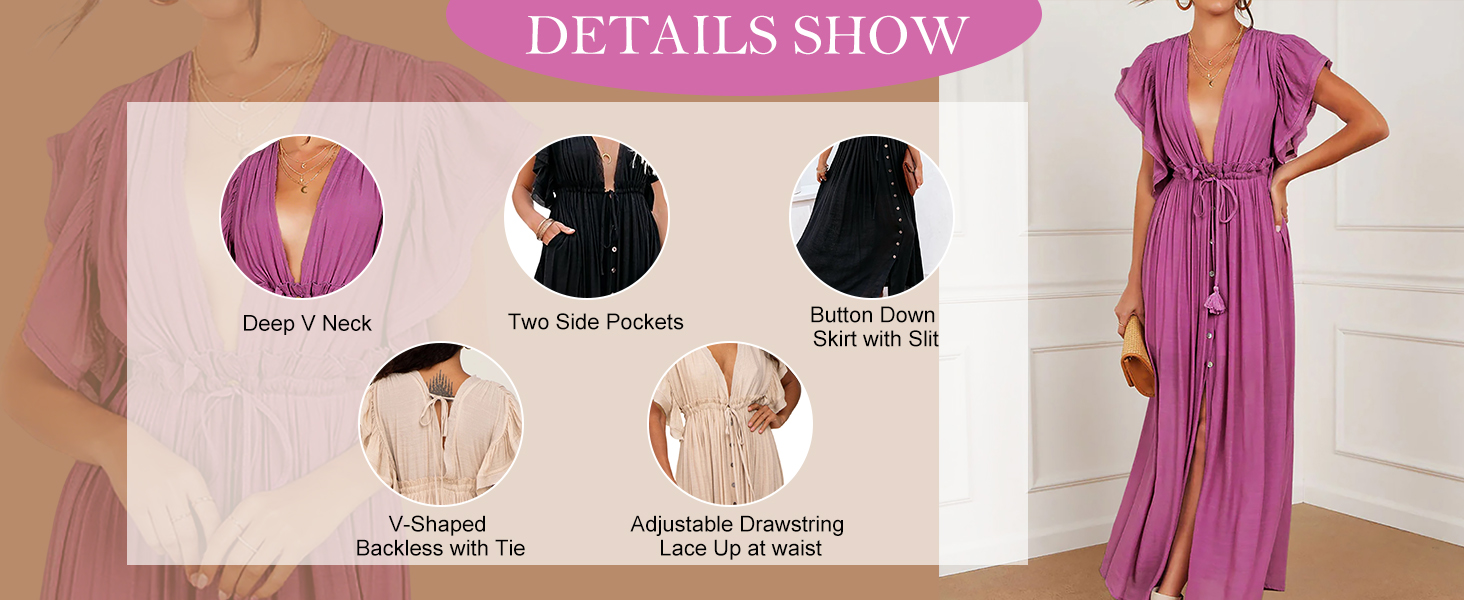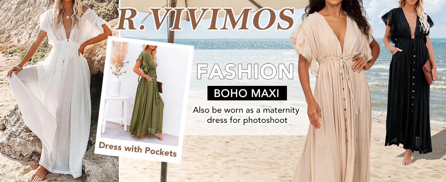 R.Vivimos Womens Drawstring Tie Long Dresses with PocketsR.Vivimos Button Down Casual Dresses for WomenR.Vivimos Deep V Neck Loose Vacation Dresses for WomenSize Chart of R.Vivimos Flowy Dresses for WomenSmall= US(4/6):--------Length: 137 cm / 53.9 inch------Bust: 101 cm / 39.8 inch-----Sleeve: 11.5 cm / 4.5 inchMedium= US(8/10): ---Length: 138 cm / 54.3 inch------Bust: 107 cm / 42.1 inch-----Sleeve: 12.5 cm / 4.9 inchLarge= US(12/14): -----Length: 139 cm / 54.7 inch------Bust: 115 cm / 45.3 inch-----Sleeve: 13.5 cm / 5.3 inchX-Large= US(16/18): ---Length: 140 cm / 55.1 inch------Bust: 123 cm / 48.4 inch-----Sleeve: 14.5 cm / 5.7 inch * Please strictly follow the size chart to select the size. Do not select directly according to your habits. * The size may have 2-3 cm ( 1 inch ) differs due to manual measurement. Please note when you measure. * Suggestion of cold water hand washing. It can help items keep their shape.
