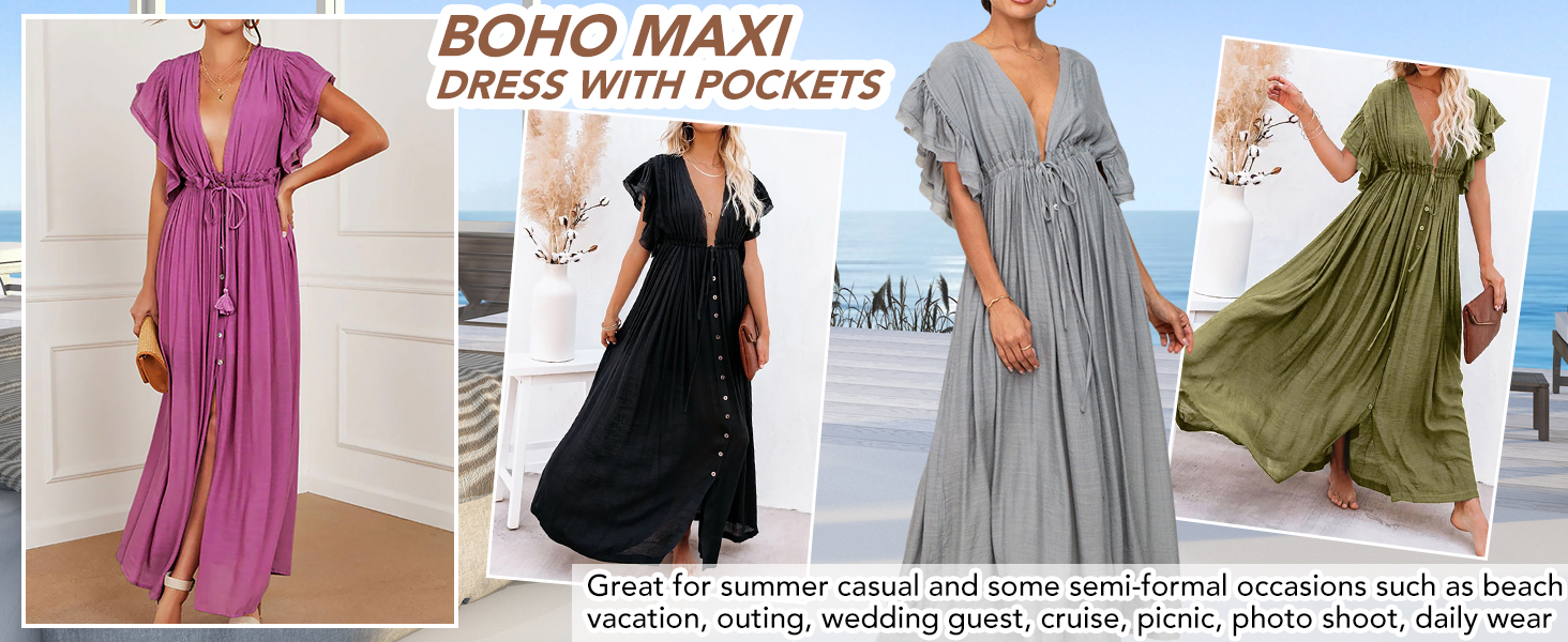 R.Vivimos Maxi Dresses for Women 2025 Summer Short Sleeve V Neck Elastic Waist Boho Loose Flowy Long Dresses with Pockets