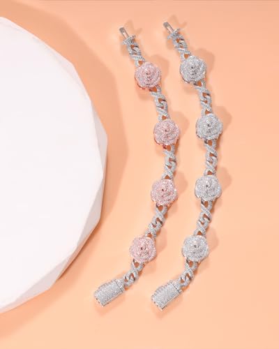 Lulu Mel Infinity Rose Gold Cuban Chain Bracelet for Men Women, Iced Out Silver Rose 5A Cubic Zirconia Diamond Cuban Charm Flower Bracelets Hip Hop Gift 5