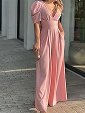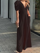 Highlights [Fabric] : Crafted from high-quality polyester, this women's jumpsuit offers a sleek and comfortable feel. The material's micro-elasticity ensures a flexible and comfortable fit, perfect for everyday wear in the summer. [Fit] : The jumpsuit boasts a regular fit with a sophisticated silhouette. Its wide-leg pants provide a touch of elegance, while the cinched waist beautifully accentuates an hourglass shape, delivering both style and confidence to the wearer. [Design Highlights] : Featuring a stylish deep V-neckline, this jumpsuit adds a hint of allure to any ensemble. The backless design and convenient pockets enhance functionality and modern appeal. The short, puffed sleeves contribute to a chic, dramatic look suitable for various occasions. [Occasions] : Ideal for streetwear, daily outings, or weekend events, this jumpsuit seamlessly transitions from casual gatherings to more formal engagements. Whether you’re going out with friends or attending a summer event, this piece embodies elegance and trendy style. [Size Range] : Available in a range of sizes including S, M, L, XL, 2XL, and 3XL, this jumpsuit caters to diverse body types, ensuring a well-suited choice for every fashion-forward woman.