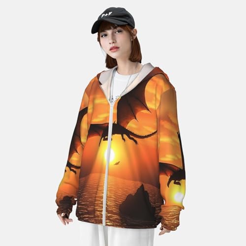 HOT ! Men's Sun Shirts UPF 50+ Sea Sunset Flying Dragon Sun Protection Hoodie Lightweight Long Sleeve Rash Guard