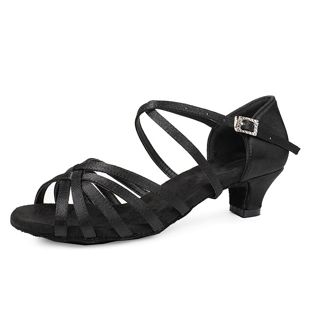 Women's Black Strappy Latin Dance Shoes - Satin Open-Toe Sandals with Low Heel and Suede Sole for Ballroom, Salsa, and Tango