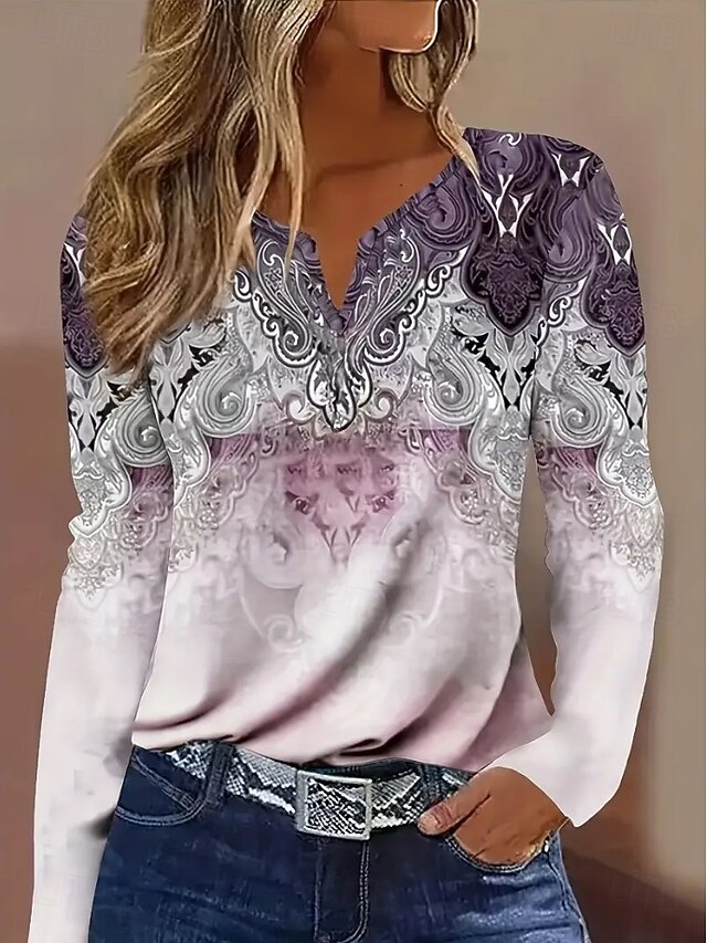 HOT ! Women's T Shirt Graphic Plants Tribal Vintage Stylish Casual Long Sleeve V Neck Notched Neck Regular Tops Daily Weekend Print Blue Purple Spring Fall Winter