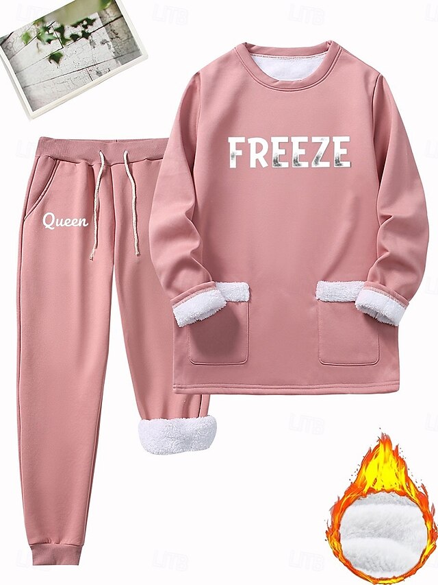 Women's Warm Daily Two Piece Sets Tracksuit Pants Sets Long Sleeve Crew Neck Letter Drawstring Print Casual Daily Black Dark Pink Blue Fall Regular Fit 10