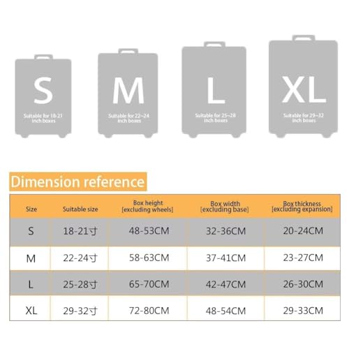 • 4 Size Available:S (Suitable for 18---21 inch luggage),M(Suitable for 22---24 inch luggage),L(Suitable for 25---28 inch luggage),XL(Suitable for 29 - 32 inch luggage),If your luggage is soft shell style,please order a bigger size