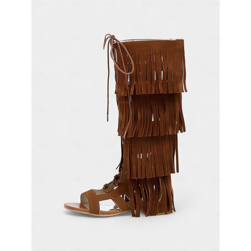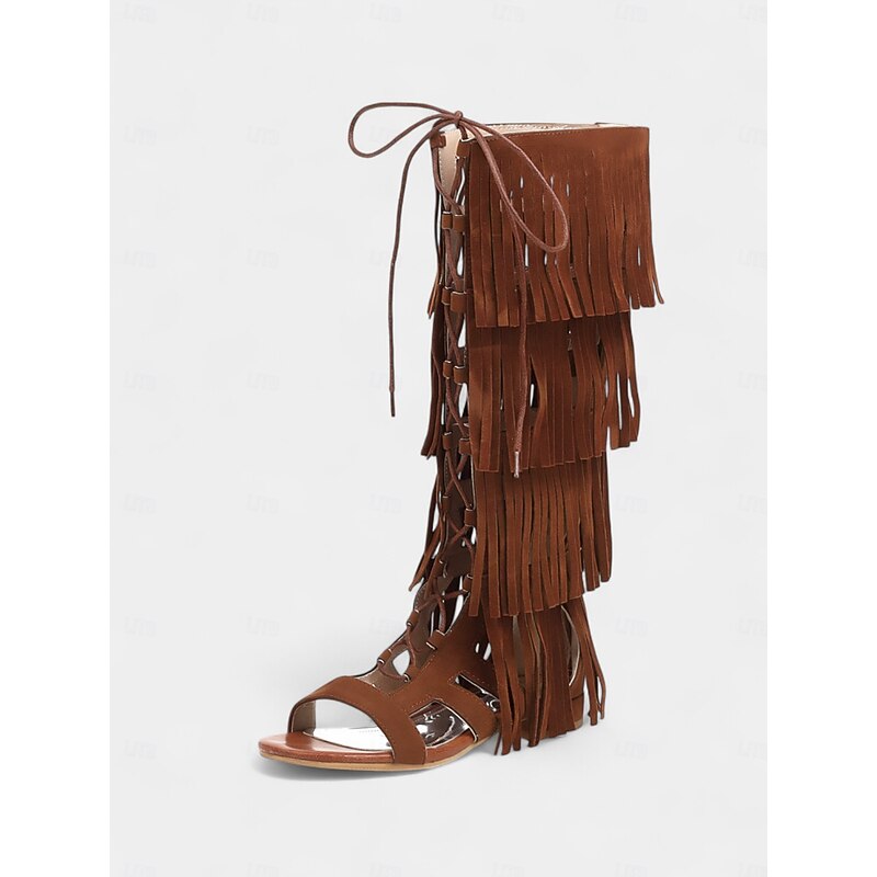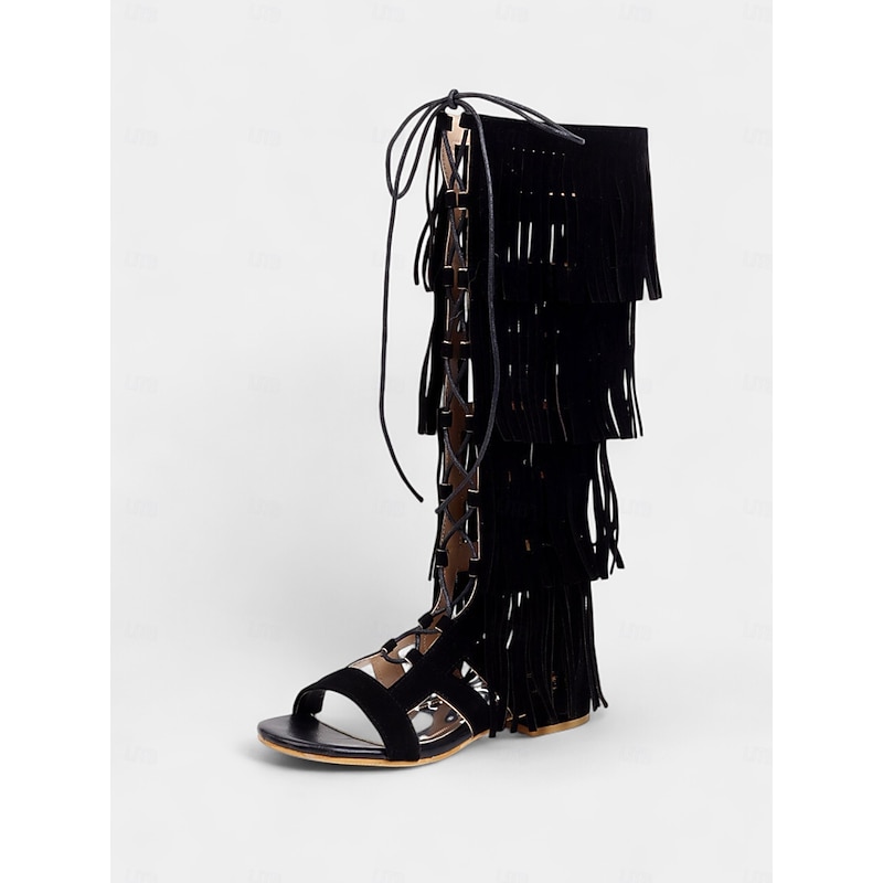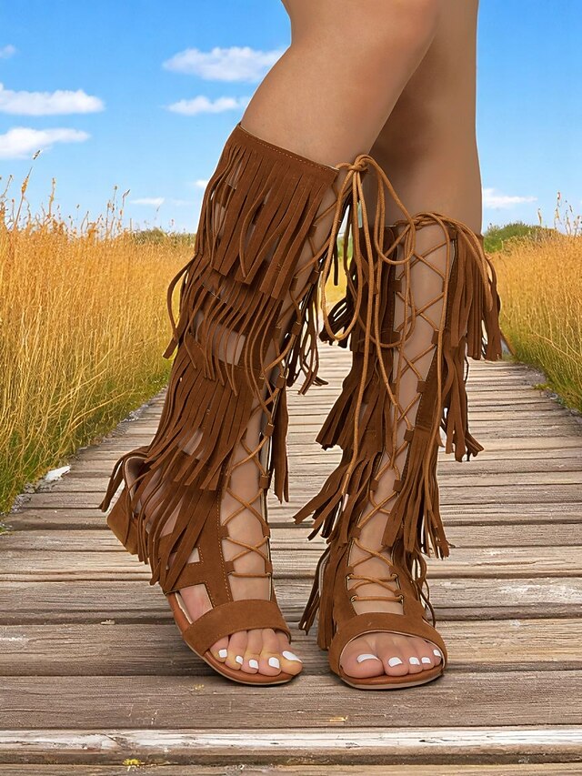 Women's Bohemian Knee-High Gladiator Sandals with Fringe and Lace-Up Design – Festival-Ready Statement Shoes for Summer Events 2