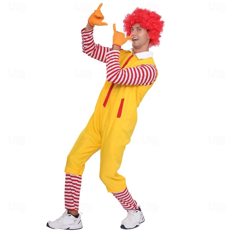 Highlights [Fabric] Crafted from high-quality polyester, this Joker Clown Carnival Costume promises comfort and durability, allowing for easy movement while maintaining a vibrant appearance. [Fit] The costume features a loose and relaxed fit, designed as a one-piece jumpsuit that is suitable for both children and adults. It provides ample space for layering, ensuring ease of wear during festive events or performances. [Design Highlights] This playful ensemble includes a vibrant yellow jumpsuit with bold red accents, such as stripes and pocket decorations, offering a quirky and cheerful vibe. The red and white striped long sleeves add a whimsical contrast, while the white collar gives a classic touch. Completing the look are red curly wigs and yellow gloves, which enhance the overall colorful and entertaining appeal. [Occasions] Ideal for a range of festive occasions such as Halloween, Carnival, and Mardi Gras, this costume is perfect for stage performances, parties, and themed events. Its lively design makes it a standout choice for capturing attention and spreading cheer. [Size Range] Available in sizes for kids and adults, the costume caters to various age groups including 3-4 years (110cm), 4-5 years (120cm), 5-6 years (130cm), 7-8 years (140cm), and 9-10 years (150cm), as well as standard adult sizes S, M, and L.