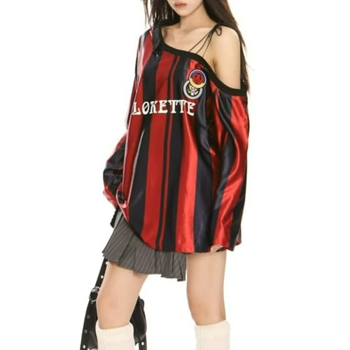 • Design Description:Y2K-inspired off the shoulder pullover featuring glossy satin vertical stripes and embroidered graphic patches. Designed with asymmetrical neckline and thin strap tie-up detailing for a bold and stylish streetwear look