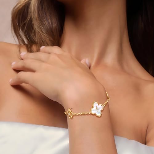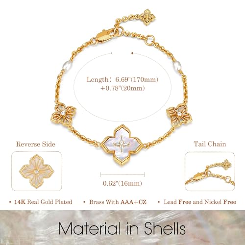 HOT ! Fettero Gold Bracelets for Women Pearl Clover Charm Bracelet 14K Gold Plated 2 Sided Four Leaf Flower Dainty Chain Clover Bracelet Jewelry