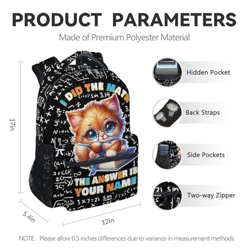 Customizable & Unique Design: Click “Customize Now” to add your special touch! Add your child’s name to create a unique schoolbag. Our personalized cat bookbags feature vibrant prints and playful patterns, making them excellent for kids who love expressing their styleDurable & Easy to Use: Made from tear-resistant polyester fabric with reinforced stitching, this cat schoolbag is built to last. Smooth-gliding zippers are easy to open and close, a top handle makes it portable, great for school, trips, or outdoor travelLarge Capacity for School Needs: 12 L x 5.4 W x 17 H. With a large main compartment, inner pockets, front zippered pockets, and expandable side pockets, this 17 inch custom cat backpack keeps everything organized - from books and folders to water bottles and snacksErgonomic Comfort for Growing Kids: Designed for teens and kids , this 17 inch cat backpack features padded and adjustable shoulder straps that reduce shoulder strain and help maintain proper posture. The breathable mesh back panel keeps kids cool during long daysBeautiful Gift for Kids: Bright colors and customizable options make this personalized bookbag a thoughtful gift for birthdays, back-to-school, or holidays. The breathable design ensures all-day comfort Perfect for everyday use. supreme materials and excellent craftsmanship ensure long-lasting durability.