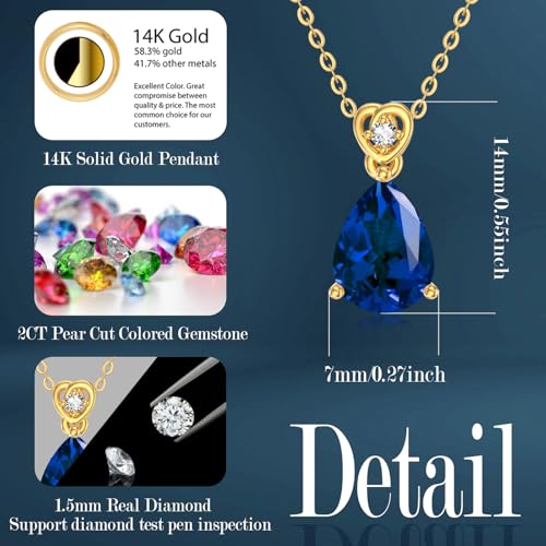 HOT ! 14k Gold Pear Gemstone Birthstone Necklace with Real Diamond(I2-I3 Clarity),2 Carat Teardrop Created Birthstone Anniversary Birthday Mother's Day Necklaces for Women Mom Her