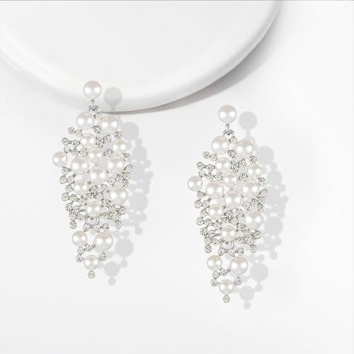 HOT ! Bridal Pearl Earrings for Women Elegant Large Sparkling Crystal Rhinestone Cluster Chandelier Simulated Pearl Long Dangle Drop Earrings Bridal Wedding Prom Jewelry Gifts