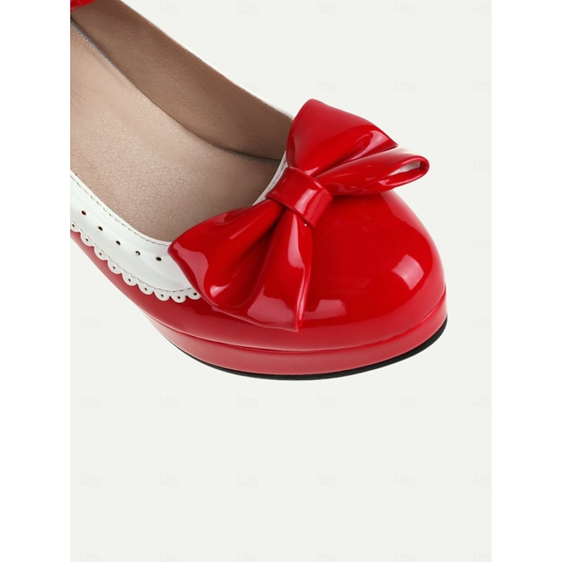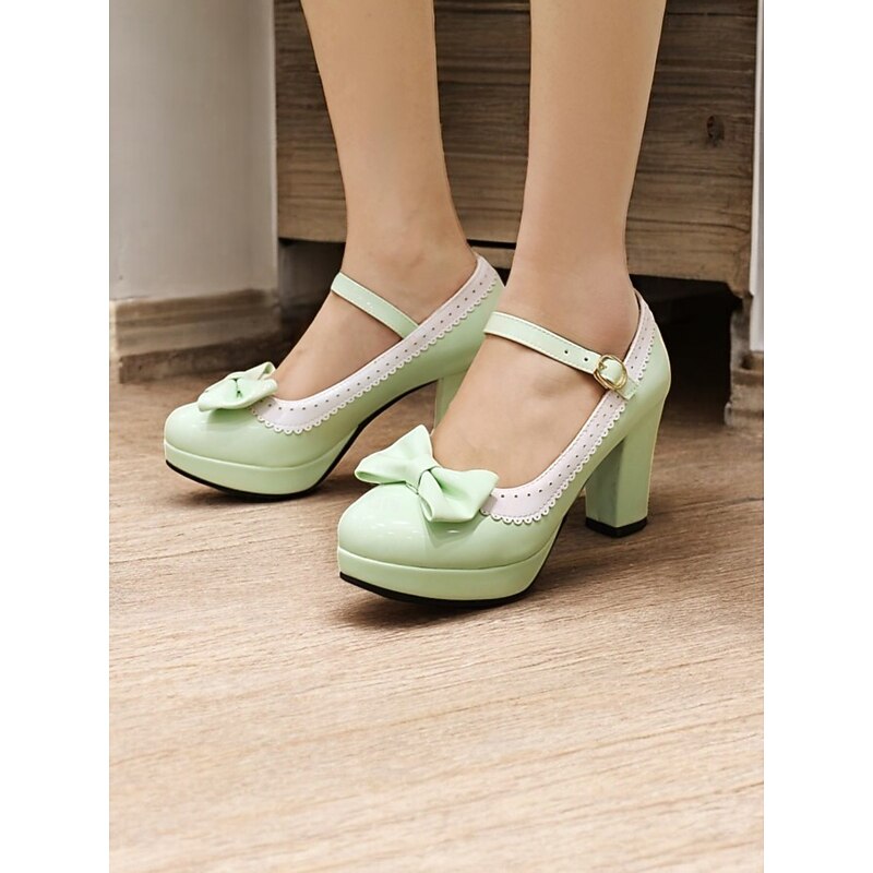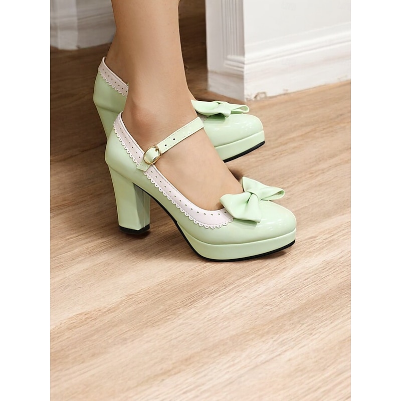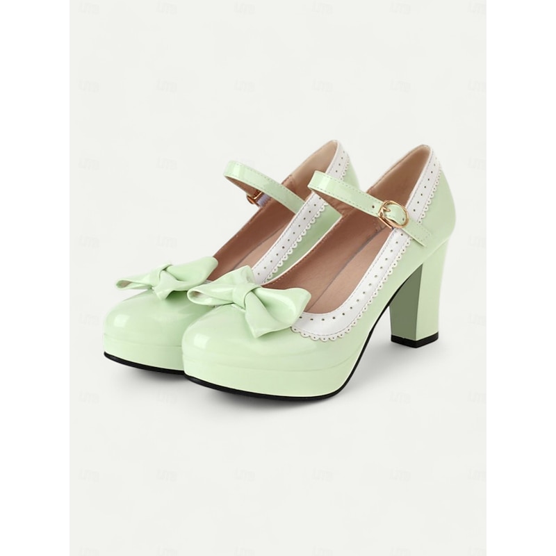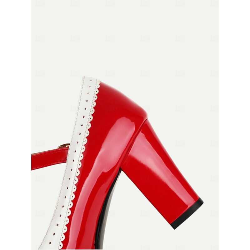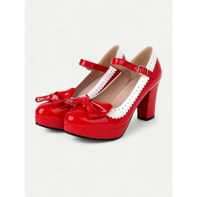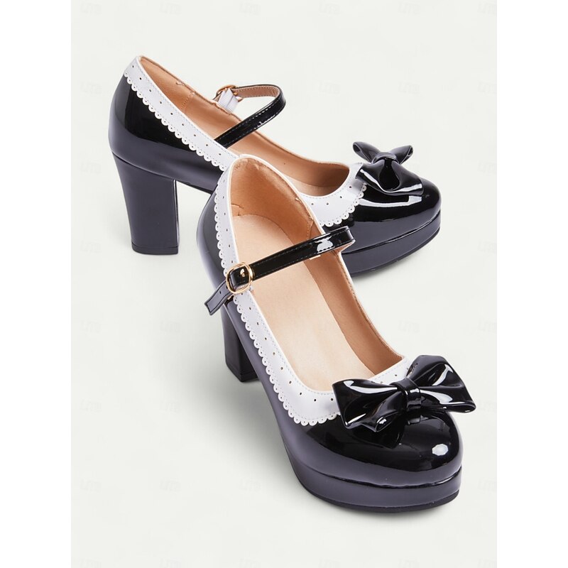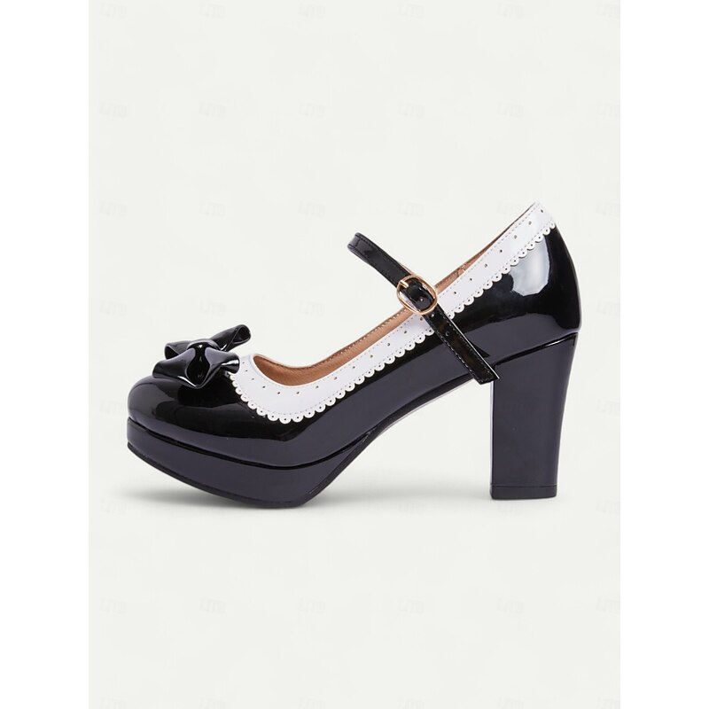 Highlights [Fabric and Materials] : Crafted with high-quality PU for the upper material and synthetic leather lining, these shoes offer a glossy patent leather finish that lends an elegant and sophisticated appeal. The rubber outsole provides durable support for everyday wear. [Silhouette and Fit] : These vintage-inspired Mary Jane heels feature a sturdy chunky heel and platform design, offering both height and comfort. The shoes include a round toe shape ensuring a comfortable fit, while the adjustable ankle strap with a metallic buckle secures the foot snugly for those long wear times. [Design Highlights] : A charming bowknot embellishes the front of the shoe, paired with a striking white scalloped trim, enhancing the retro aesthetic and adding a playful yet chic touch. The metallic buckle on the strap gives it an added vintage flair. [Occasions] : Perfect for a variety of settings, these heels are ideal for daily outings, work, or special events where you want to make a fashion-forward statement. Their classic design and elegant style make them versatile for both formal occasions and fashionable everyday outfits. [Size Range] : Available in sizes from US5.5 / EU35 / UK3.5 to US10.5 / EU42 / UK8.5, these shoes are designed to fit standard sizing. It is recommended to select your usual size for the best fit.