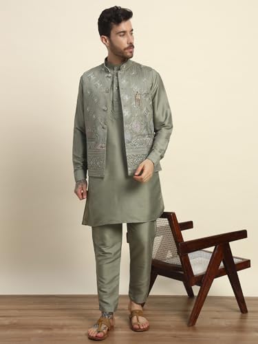Mens Heavy Cotton Silk Sequence Kurta Trouser Set With Waistcoat (Nehru Jacket) (C-118) 3