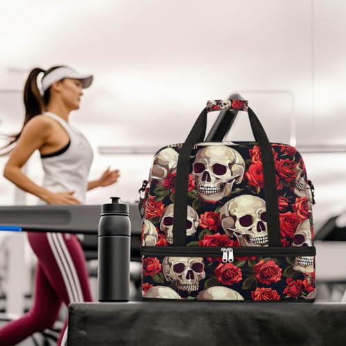Foldable Carry On Bag for Travel, Expandable Duffle Bag with Shoe Compartment, Skull Red Rose Lightweight Sports Gym Tote with Trolley Sleeve 1