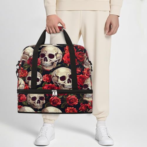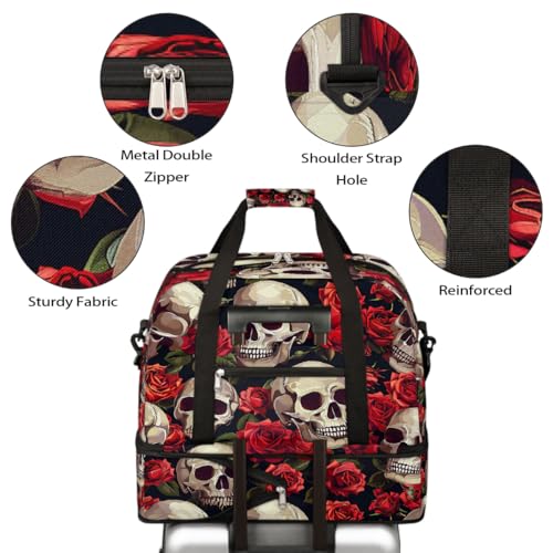 HOT ! Foldable Carry On Bag for Travel, Expandable Duffle Bag with Shoe Compartment, Skull Red Rose Lightweight Sports Gym Tote with Trolley Sleeve