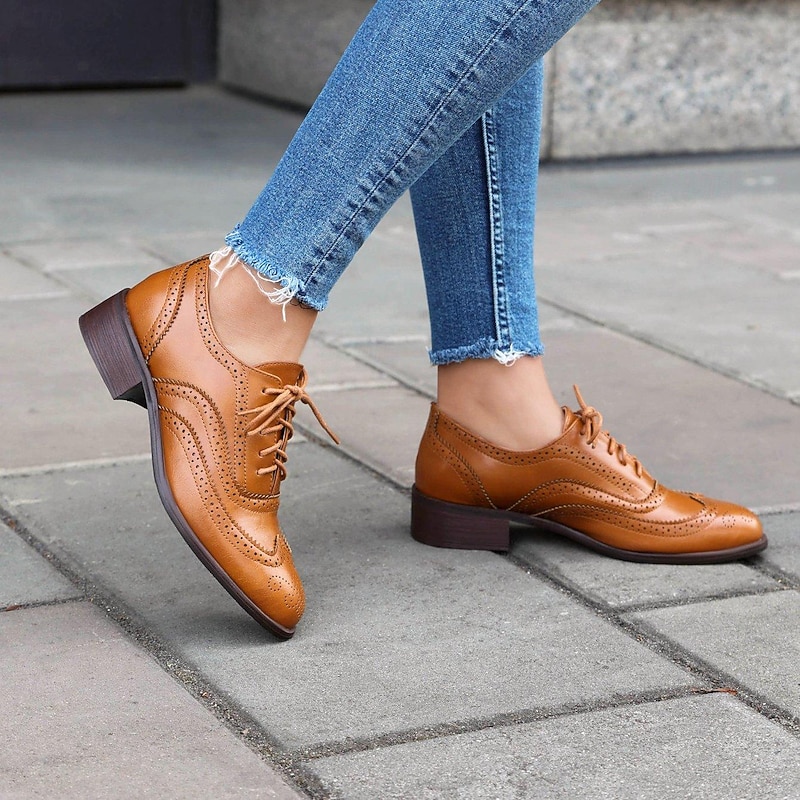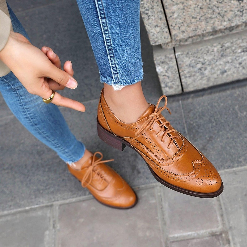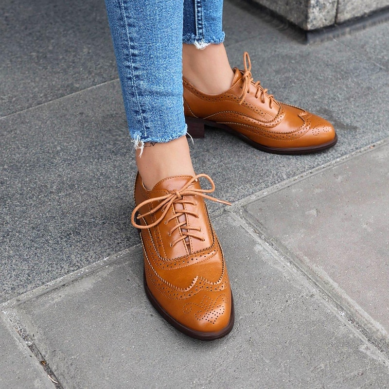 HOT ! Women's Brown Faux Leather Brogue Oxford Shoes - Lace-Up Vintage Style Flats with Wingtip Detailing for Casual or Formal Wear