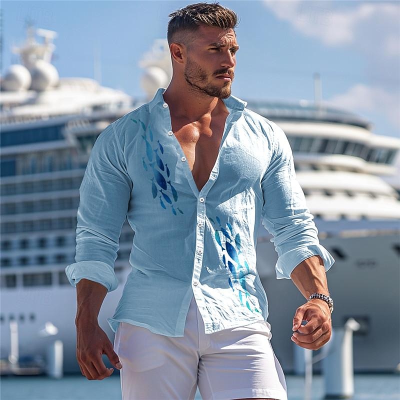 : The shirt showcases a captivating waves seascape pattern, evoking a sense of tranquility and adventure. The classic button-down front paired with a turndown collar allows for a versatile look, whether you're aiming for a smart casual appearance or something more laid-back. The long sleeves add versatility, which can be rolled up for added style and comfort in warmer settings.