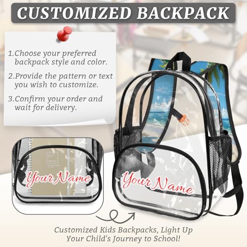 HOT ! Personalized Small Clear Backpack Stadium Approved Heavy Duty PVC Plastic Custom Transparent Backpacks See Through Bag with Name, Ocean Beach Tropical Palm Tree