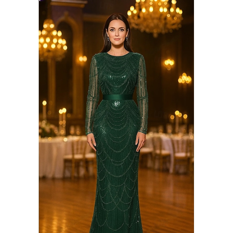 More information about Gold Sequin Beaded Mermaid / Trumpet Sheath / Column Evening Gown Elegant Formal Dress Formal Wedding Floor Length Long Sleeve Crew Neck Sequined with Geometric Patterns 2025