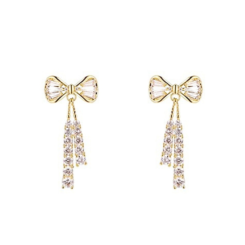 Highlights [Fabric] : Crafted from high-quality gold-tone metal, these elegant earrings are designed with meticulous attention to detail. The material ensures a refined and luxurious appearance, perfect for elevating any outfit. [Fit] : Each earring is designed to dangle gracefully, offering a lightweight feel that ensures comfort for all-day wear. The earrings are crafted to suit a variety of fashion styles, adding both elegance and sophistication to any ensemble. [Design Highlights] : Featuring a charming bow design, these earrings are adorned with shimmering crystals and sparkling rhinestones. The delicate chains attached to the bow sway with each movement, gracefully catching the light for a glamorous effect. [Occasions] : Versatile and stylish, these earrings are perfect for streetwear, daily outings, outdoor events, weekend retreats, and visits to the park. They effortlessly add a touch of elegance and sophistication to both casual and formal attire. [Size Range] : Available in one size, these earrings are designed to complement the style of adult women, making them a fashionable addition to any jewelry collection.