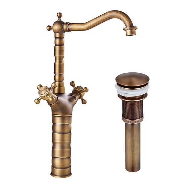 HOT ! Antique Copper Faucet with Drain,Pre Rinse Rotatable Widespread Centerset Two Handles One Hole Bath Taps with Hot and Cold Switch