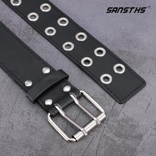 HOT ! SANSTHS Women Double Grommet Studded Belts, Black Leather Belt for Women Men Punk belt