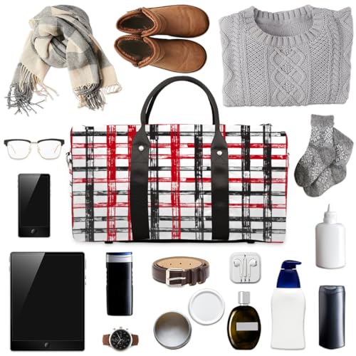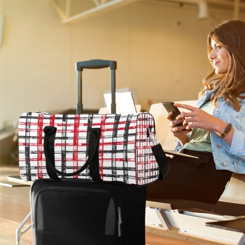 Red Black Plaid Travel Duffel Bag, up-to-date Pattern Sports Tote Gym Bag, Foldable Weekender Overnight Bag, Luggage Handle Bag for Women Men