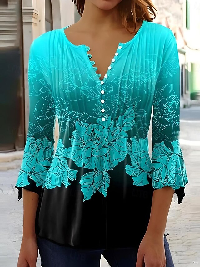 Women's Blouse V Neck Ombre Floral Graphic Elegant 3/4 Length Sleeve Regular Tops Daily Going out Buttons Black White Blue Purple Green Summer Spring Fall 2