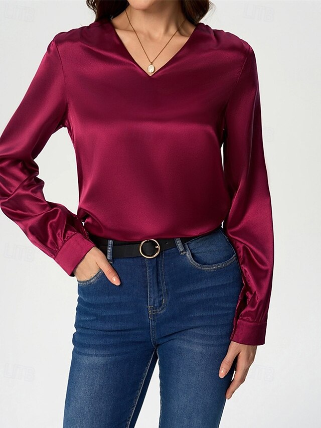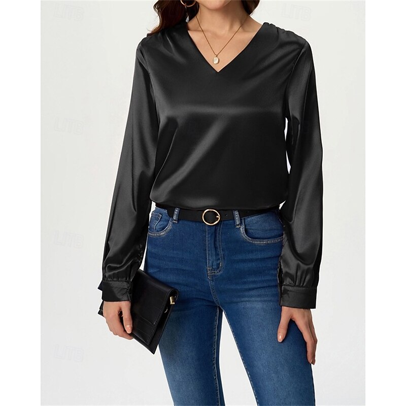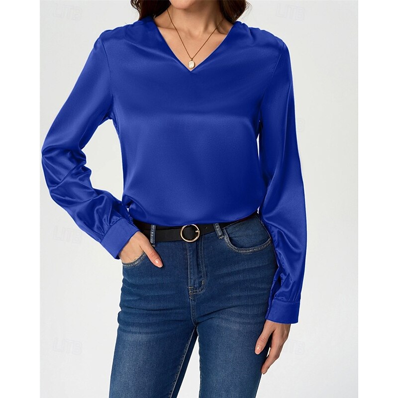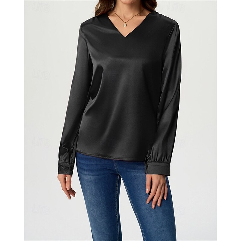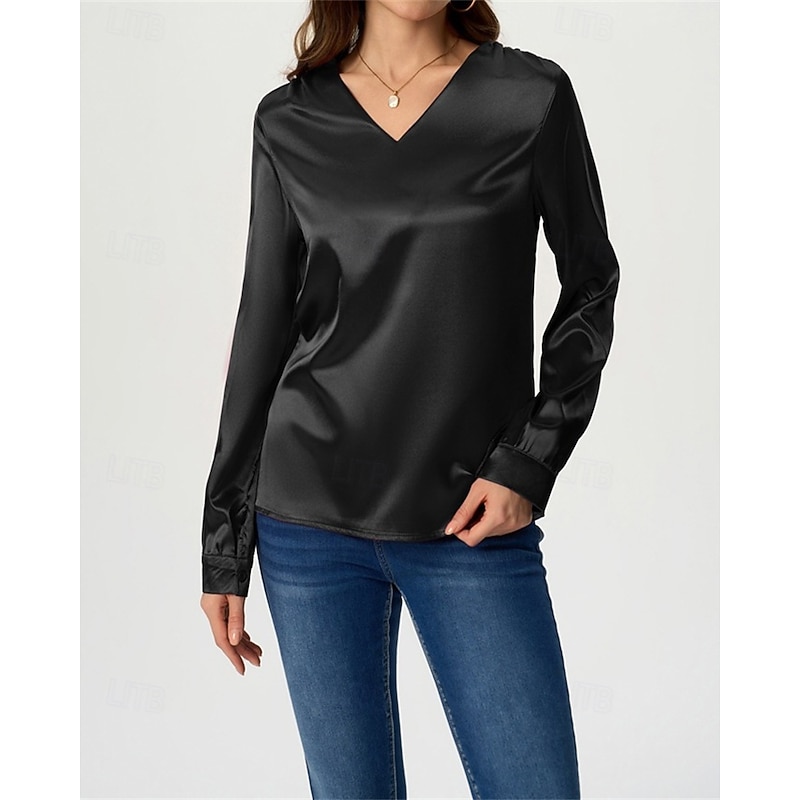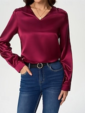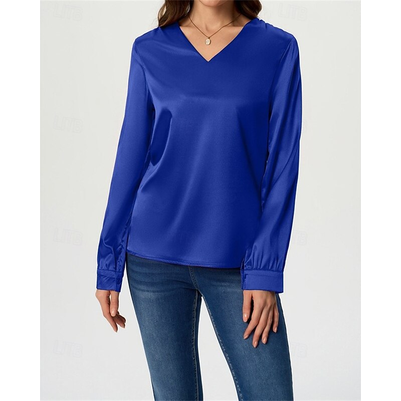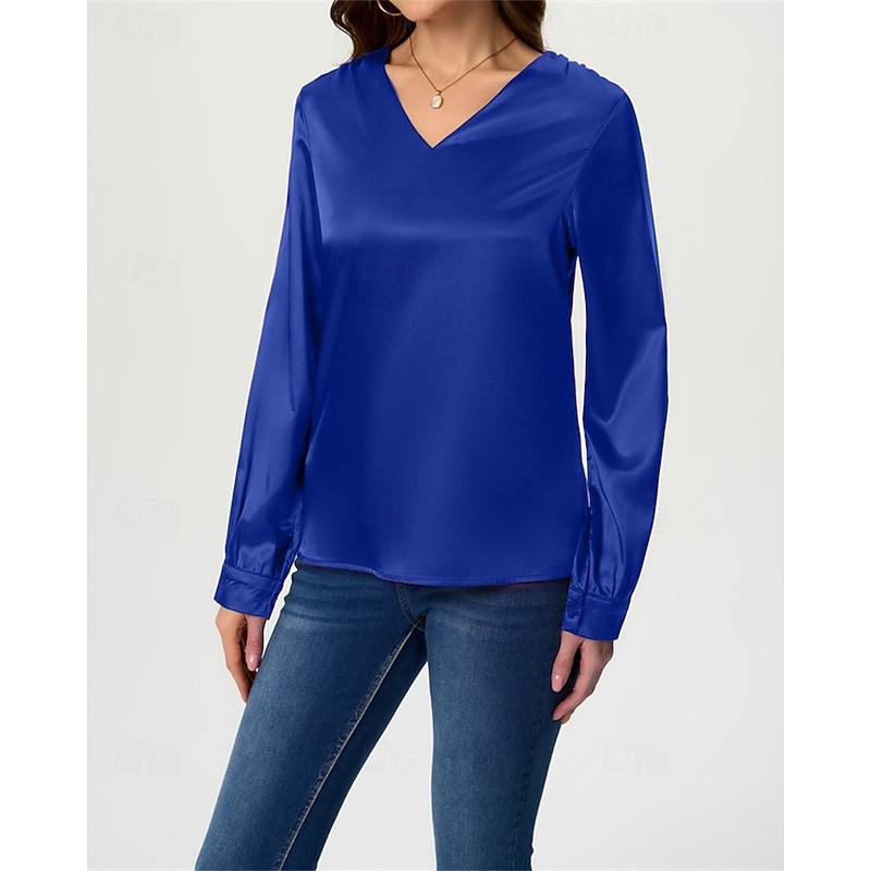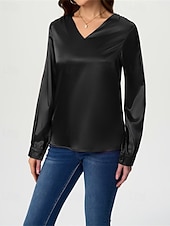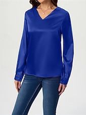 More information about Women's Shirt Elegant Dressy Satin Solid Color Stylish Casual Long Sleeve V Neck Regular Tops Daily Going out Black White Wine Royal Blue Green Spring Fall
