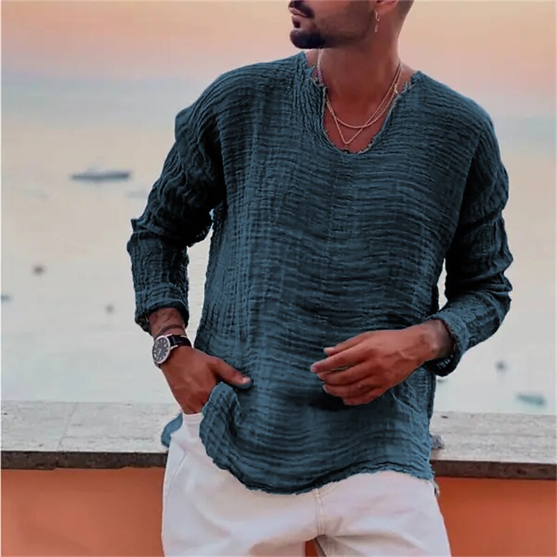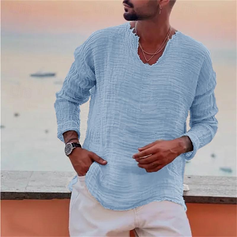 Highlights Product Selling Points: - Made from a comfortable blend of cotton and linen fabric. - Features long sleeves for extra coverage and warmth. - Specifically designed for men. - A versatile linen shirt that can be worn on vacation or any casual occasion. - The V-neckline adds a stylish touch to the overall design.