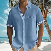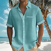 More information about Men's Geometric Grid / Plaid Shirt Summer Shirt Button Up Shirt Short Sleeve Fashion Casual Vacation Holiday Streetwear Summer Turndown 3D Print Front One Pocket Linen Like Shirt Yellow Blue Green