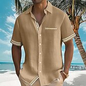 Men's Geometric Grid / Plaid Shirt Summer Shirt Button Up Shirt Short Sleeve Fashion Casual Vacation Holiday Streetwear Summer Turndown 3D Print Front One Pocket Linen Like Shirt Yellow Blue Green 10