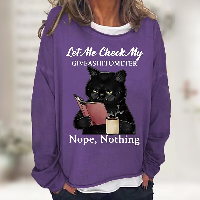Highlights [Fabric] : Crafted from a soft blend of cotton and polyester, this women's sweatshirt offers both comfort and durability. Its cozy fabric makes it an excellent choice for fall and winter wear, ensuring warmth while maintaining breathability. [Fit] : The sweatshirt features a relaxed fit with drop shoulders, creating a laid-back and oversized silhouette. This design provides plenty of room for comfortable movement, making it perfect for casual outings or lounging at home. [Design Highlights] : Showcasing a playful black cat print, complete with a humorous caption, this sweatshirt adds a fun and quirky element to your wardrobe. The round neckline and long sleeves contribute to its casual charm, while the micro-elastic property provides a bit of stretch for added comfort. [Occasions] : Ideal for casual occasions and sports activities, this versatile piece can be paired with jeans or leggings for a stylish and effortless look. It's also a great choice for cat lovers or those who appreciate unique fashion statements. [Size Range] : Available in a wide range of sizes from S to 3XL, this sweatshirt caters to various body types, ensuring a comfortable fit for everyone.