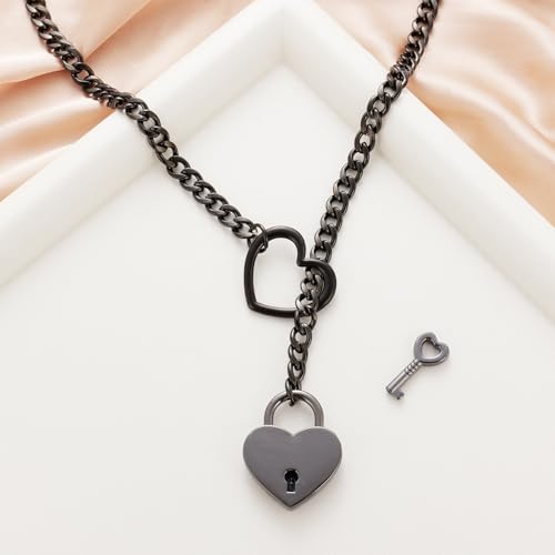 Women's Stainless Steel Heart O-Ring Adjustable Lariat Y-Necklace Punk Long Cuban Lock Necklace with Key 4