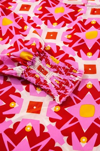 HOT ! Women's Strawberry Pink Geometric Print Loose Blouse with Shirred Cuffs
