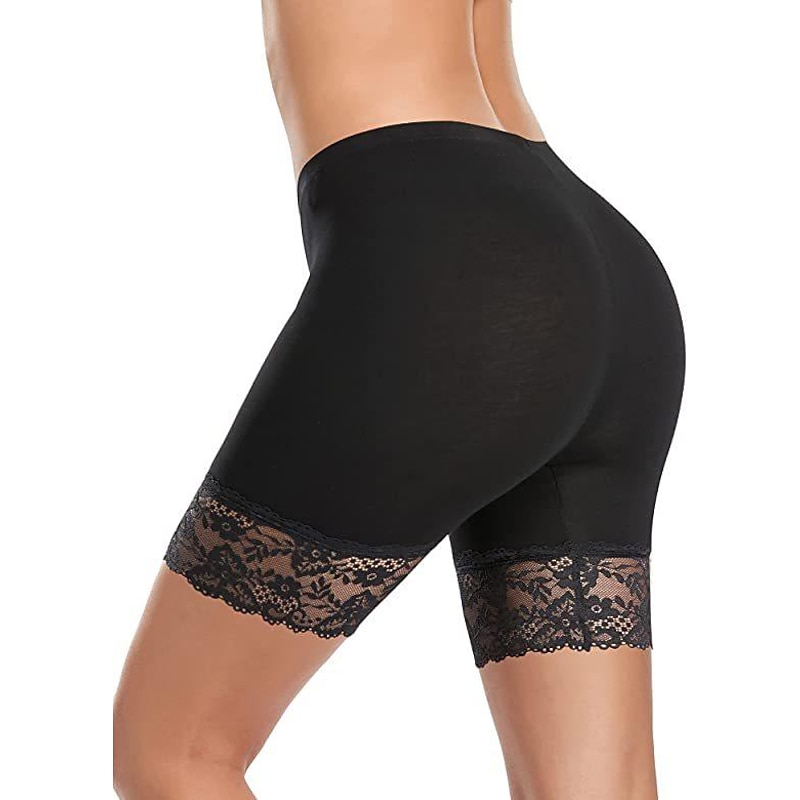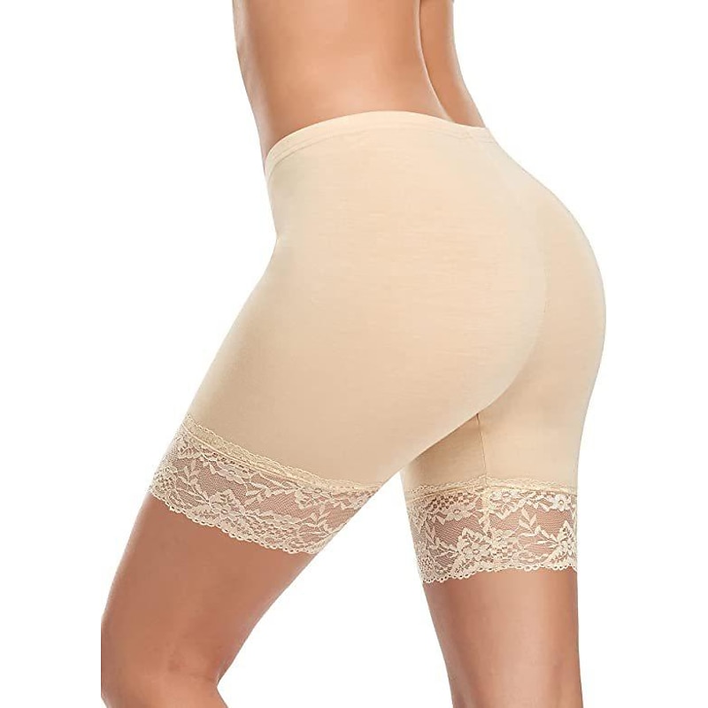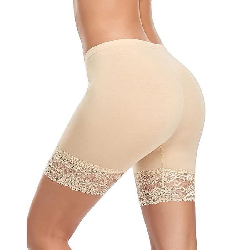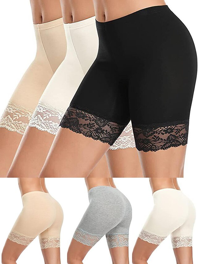 Highlights [Fabric] : Crafted from high-quality modal and stretchy materials, these Women's Underwear Shorts Leggings provide a soft and comfortable feel, ensuring breathability for all-day wear. [Fit] : Designed with a seamless, high-waisted fit, these mid-thigh shorts offer a snug yet flexible silhouette, ideal for everyday activities and comfortable loungewear. [Design Highlights] : Featuring intricate lace detailing along the hem, the shorts add a touch of feminine elegance. The breathable and soft lace ensures a gentle feel against the skin, enhancing the overall comfort. [Occasions] : Perfect for casual daily wear, these versatile leggings are suitable for various settings, whether worn discreetly under clothing or styled as comfortable home outfits. [Size Range] : Available in a range of sizes from S to 2XL and offered in neutral colors such as White, Black, Grey, and Nude, these shorts provide options for a variety of body types and preferences.