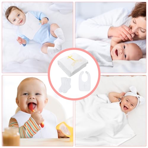 HOT ! Panitay Set of 3 Baby Baptism Blanket White Bibs Baptism Socks for Baby Boys Girls Soft Coral Fleece White Receiving Blanket Christening Dedication Accessories