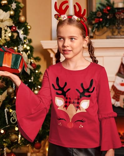 • The girls Christmas bell sleeve shirt pairs beautifully with skinny jeans or leggings for a modern look. It also looks great with an A-line or tulle skirt for a cute outfit. Finish with adorable ankle boots or festive flats for a fun holiday vibe!