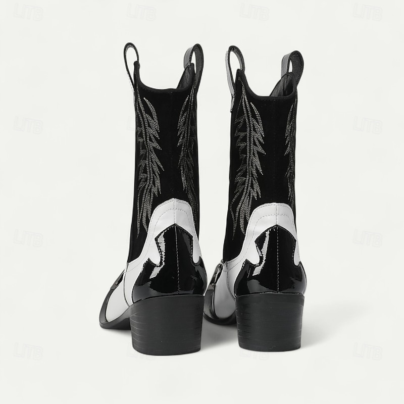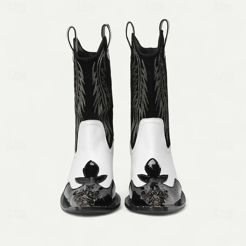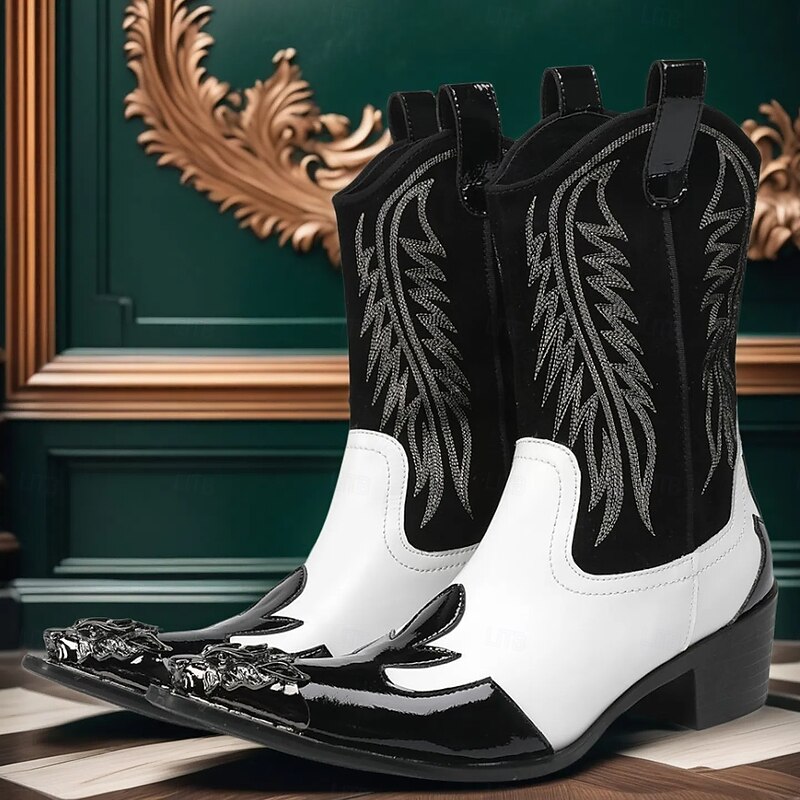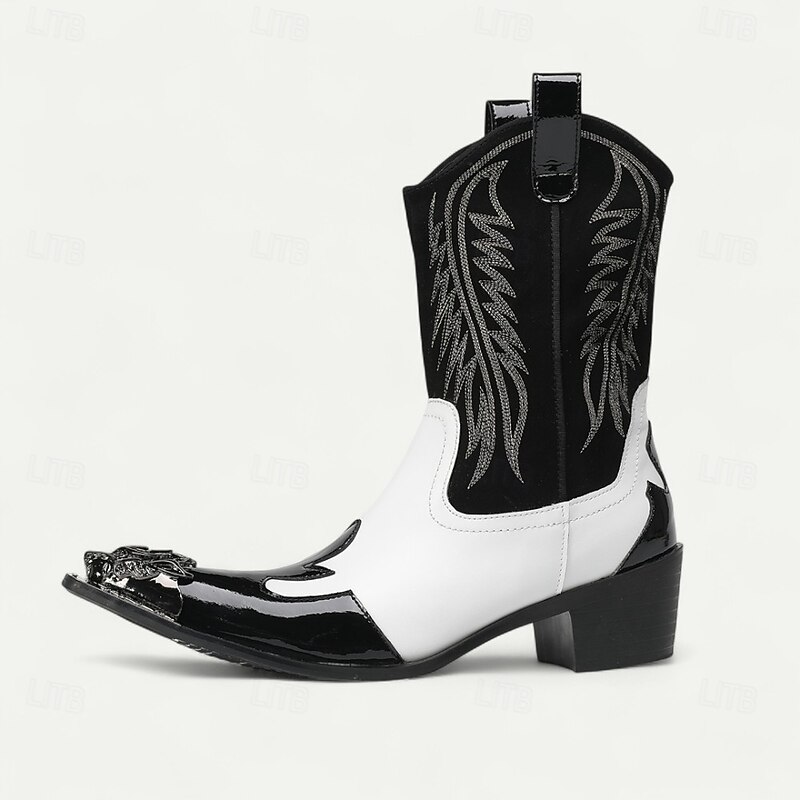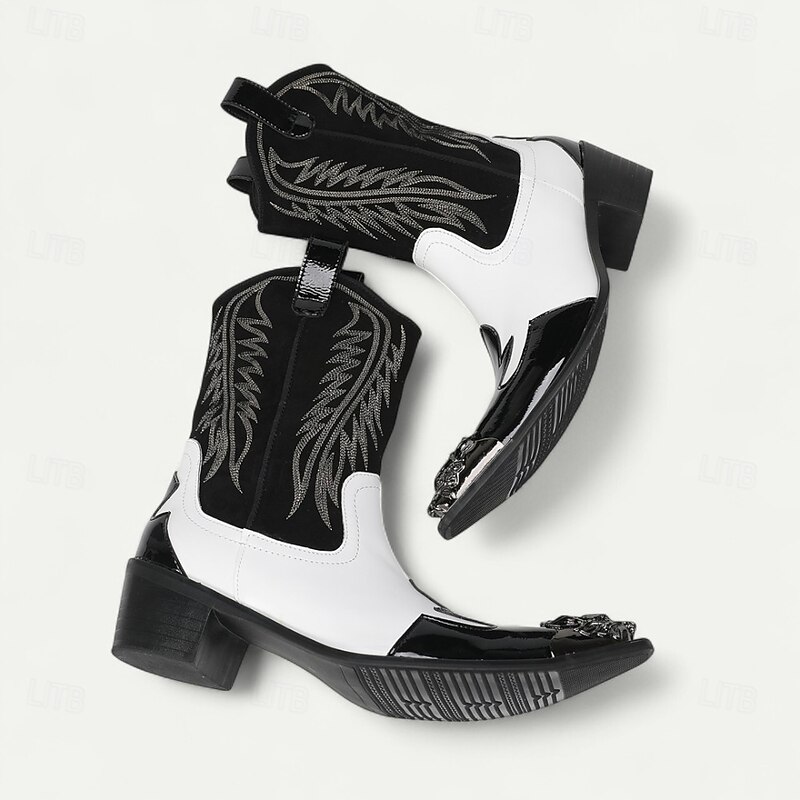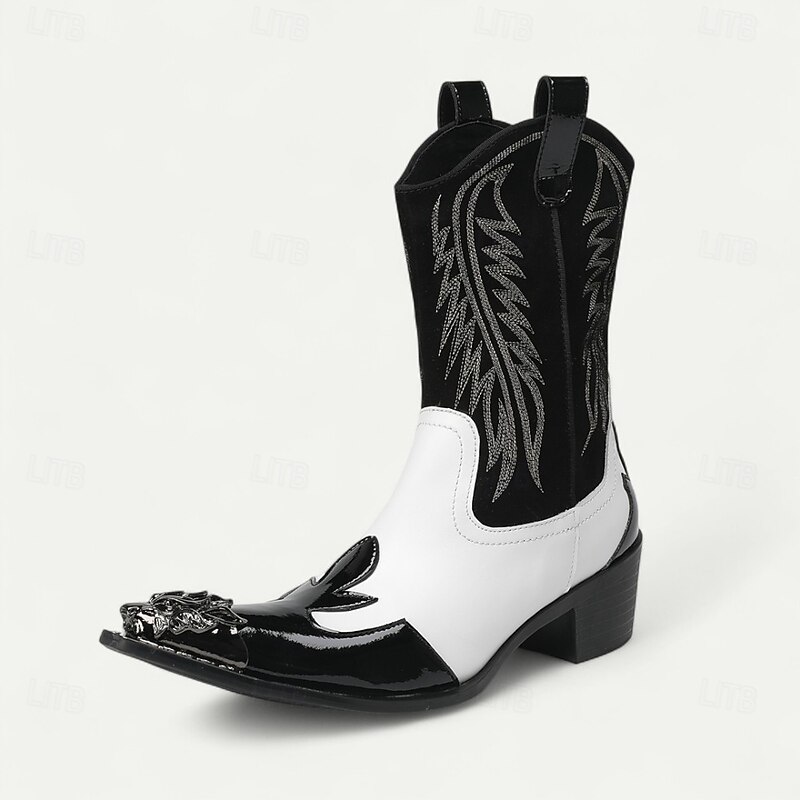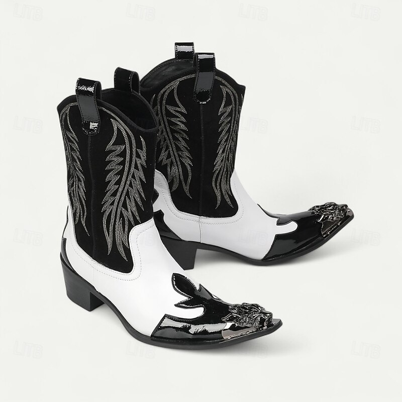 More information about Men's Blue and White Cowhide Leather Cowboy Boots with Flame Stitching and Metal Toe, Statement Western Footwear for Festivals, Stage Shows and Themed Parties