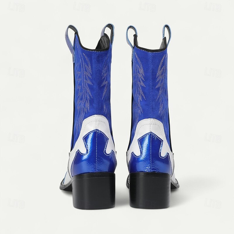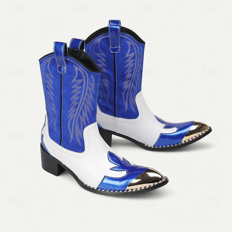 Men's Blue and White Cowhide Leather Cowboy Boots with Flame Stitching and Metal Toe, Statement Western Footwear for Festivals, Stage Shows and Themed Parties 1