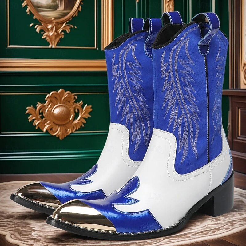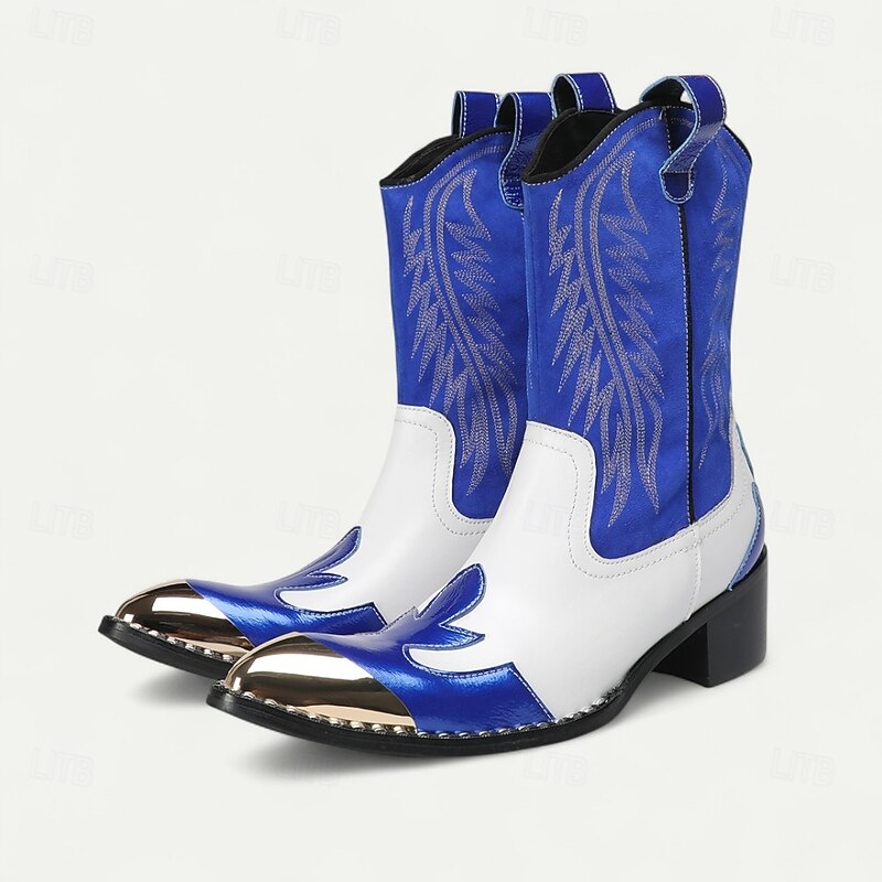 HOT ! Men's Blue and White Cowhide Leather Cowboy Boots with Flame Stitching and Metal Toe, Statement Western Footwear for Festivals, Stage Shows and Themed Parties