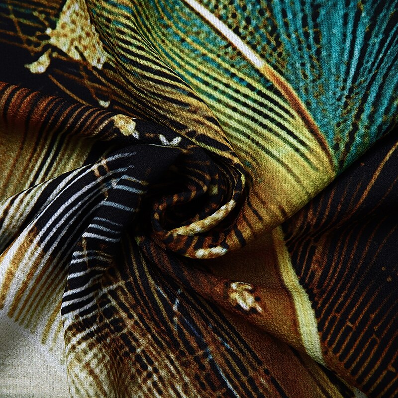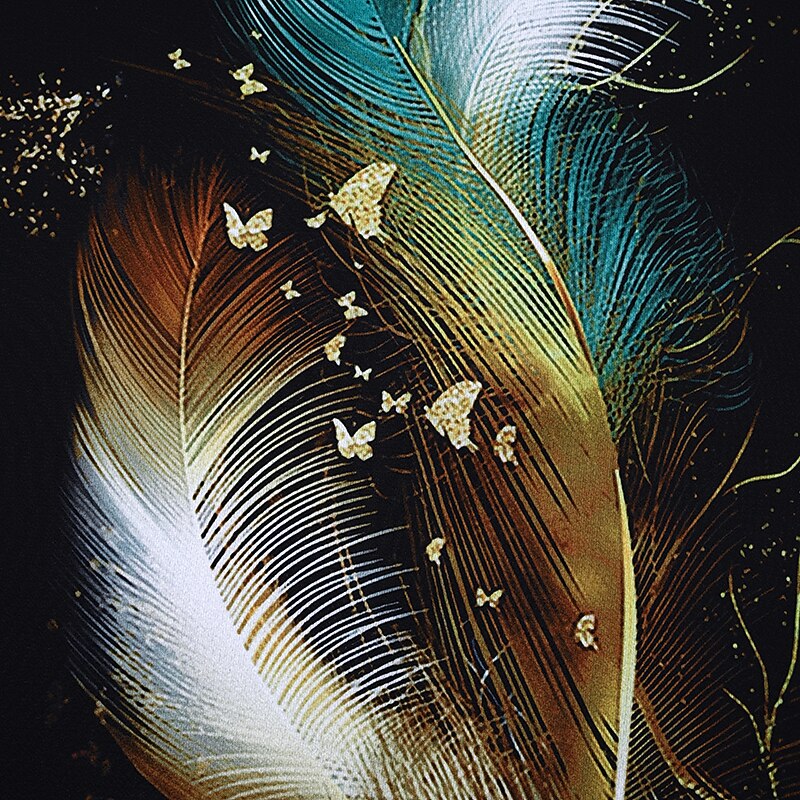 Highlights [Product Highlights] [Fabric] : Crafted from a blend of chiffon and polyester, this top offers a silky smooth touch and lightweight feel, ensuring breathability and comfort throughout the day. Its micro-elasticity provides a slight stretch for ease of movement. [Fit] : Designed with an oversized, relaxed fit, this blouse drapes elegantly over the body, allowing for casual comfort while still maintaining a chic silhouette. [Design Highlights] : Featuring a dynamic feather print in rich shades of gold and teal on a classic black backdrop, the blouse is embellished with small golden butterflies for a whimsical touch. The round crew neckline and distinctive dolman sleeves enhance its modern and sophisticated allure. [Occasions] : Perfect for daily wear, weekend outings, and holiday events, this versatile piece can be easily dressed up or down to suit any occasion. Pair it with jeans for a casual look or elevate it with tailored trousers and accessories for a more polished ensemble. [Size Range] : Available in a variety of sizes from S to XXL, offering a perfect fit for different body types and ensuring inclusivity in style.