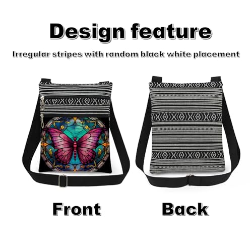 • ​​3. 【Design】​​The Butterfly crossbody bag uses heat transfer printing technology for fade-resistant patterns. The irregular black-and-white stripes are crafted with a woven process, and their placement varies randomly (positions may differ slightly due to hand-cutting). The dual-pocket design helps efficiently organize different items, while the adjustable strap accommodates exceptionally users.