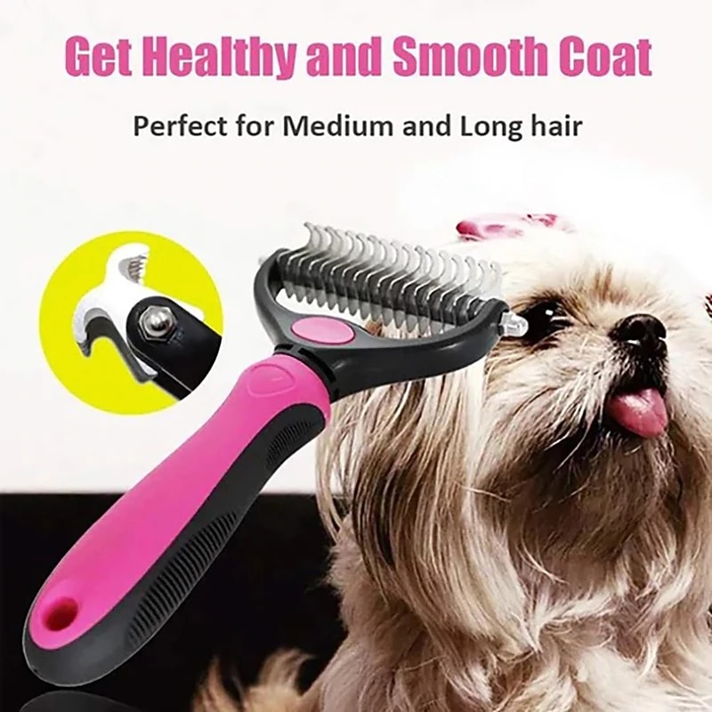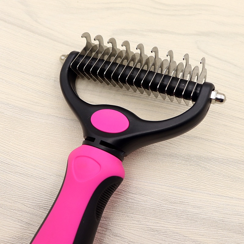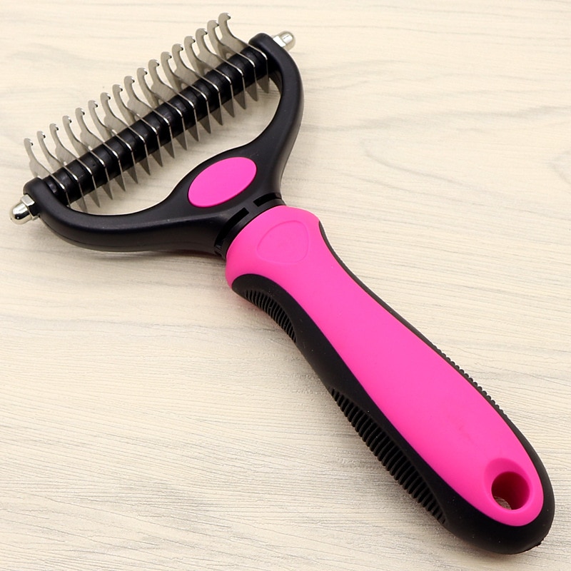 Highlights Dual-Sided Design : Start with 9 teeth side for stubborn mats and tangles and finish with 17 teeth side for thinning and deshedding. Achieve faster and more professional dematting and grooming results Skin Friendly to Your Pets : Our Dematting Brush is designed with Sharpened but Fine Rounded Teeth, allows you easily and safely remove mats, tangles, knots, loose hair without irritation or scratching Effective Dehedding Tool :This undercoat rake gently removes loose hair, and eliminates tangles, knots, dander and trapped dirt.Perfect solution for dogs and cats with thick fur or dense double coat care Comfortable to Use : Lightweight and Non-Slip rubber handle for comfortable holding and stability.You will absolutely enjoy your grooming time with this pet brush Great Gift for All Pets Lover : Since Our deshedding rake is a multi-purpose grooming tool,a must-have pet hair Remover,it would be a great gift choice for all pets lover,they will love it for sure