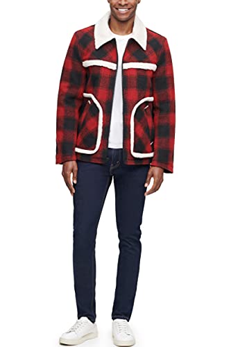 • STYLISH FEATURES: Plaid wool blend body with a sherpa laydown collar, sherpa trim detailing on pockets and chest