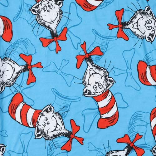 • Full-Print Design with Character Detail: This design features Cat in the Hat’s expressive faces across a light blue background, with darker blue outlines of his bow tie and top hat for layered visual texture. The all-over print adds dimension without looking too busy, creating a clean look that fans will recognize. Color contrast holds up well through multiple washes without fading.