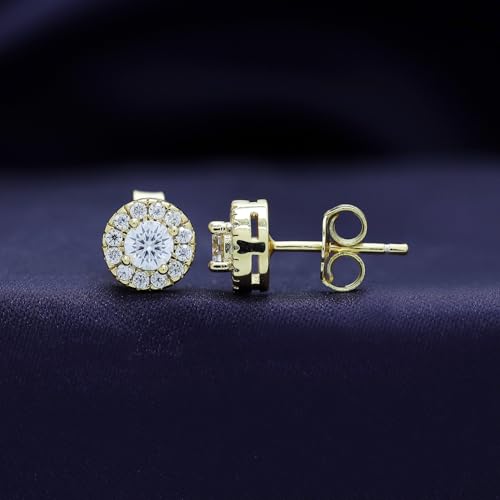 • These stunning Moissanite Halo Stud Earrings are crafted with 18K Yellow Gold Plating, ensuring a luxurious and durable finish, while the post and nuts are made from sterling silver for added comfort and durability. Ideal for sensitive ears, the combination of materials offers elegance benefits. This Created Moissanite Diamond Earrings are an enchanting, effortless look She'll love.