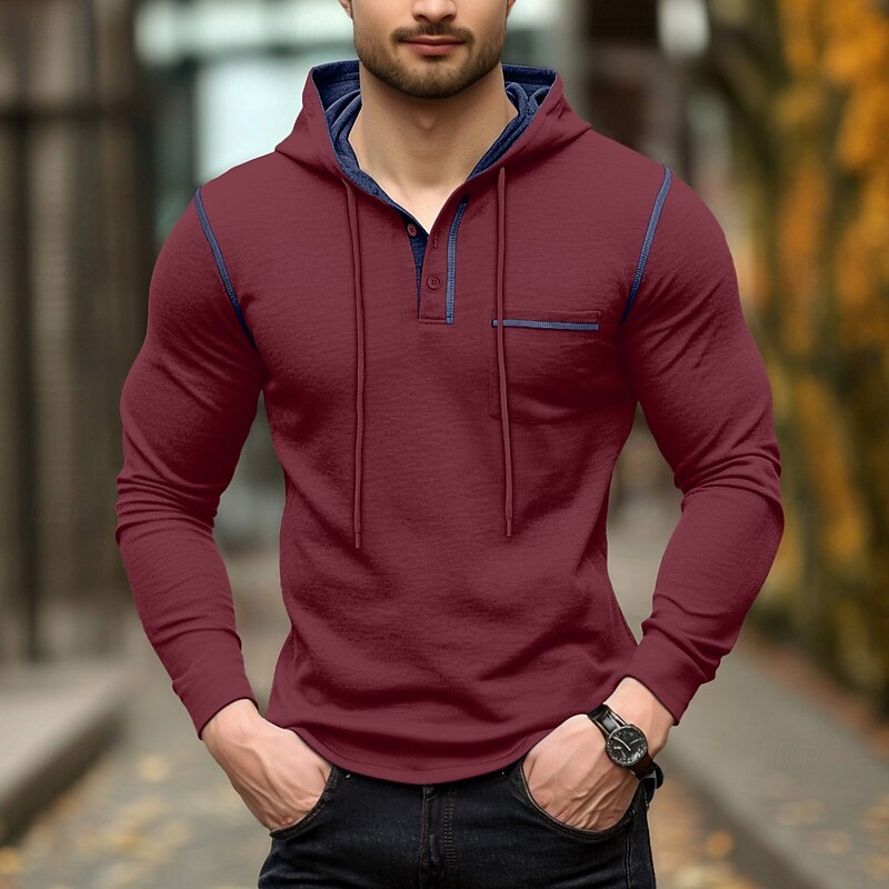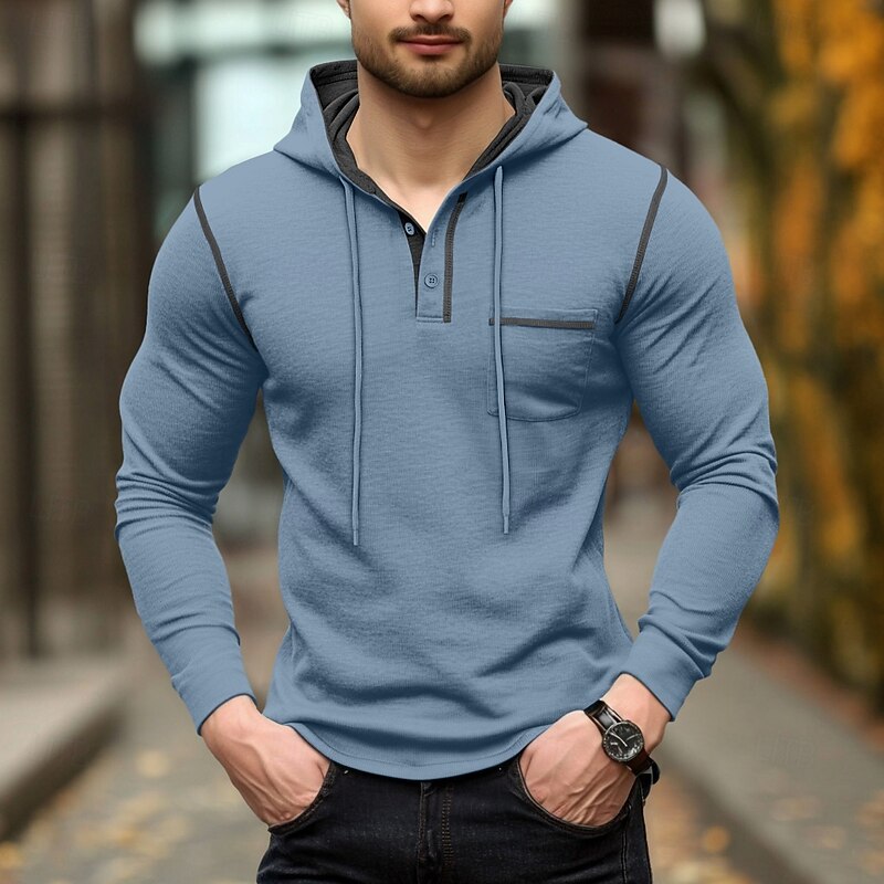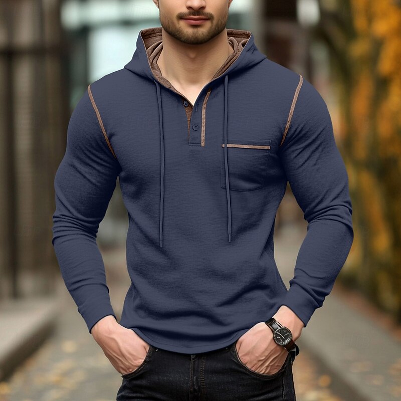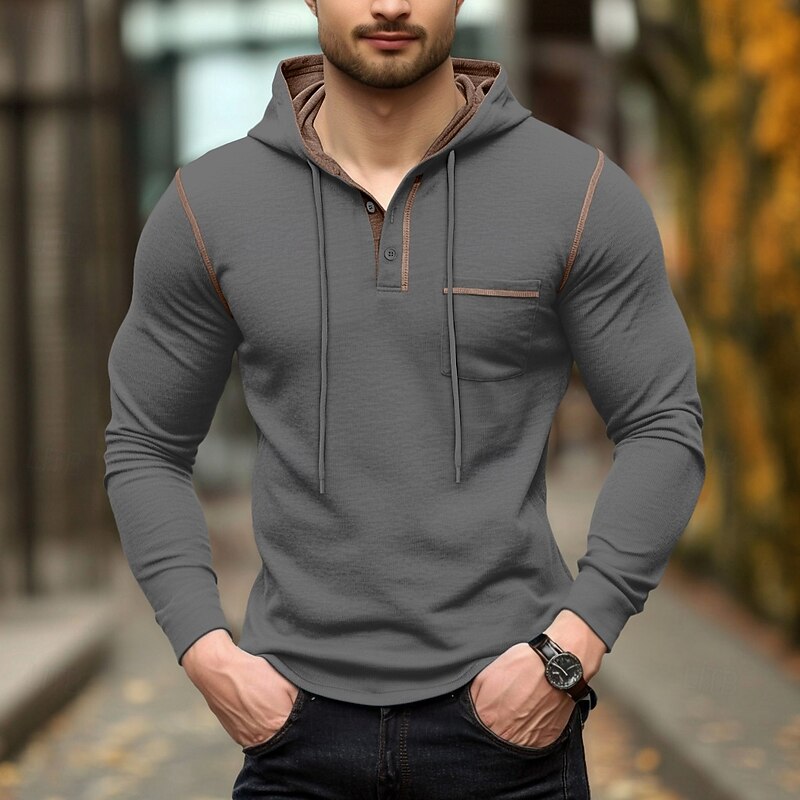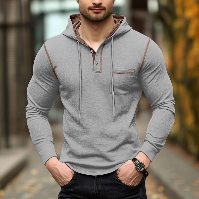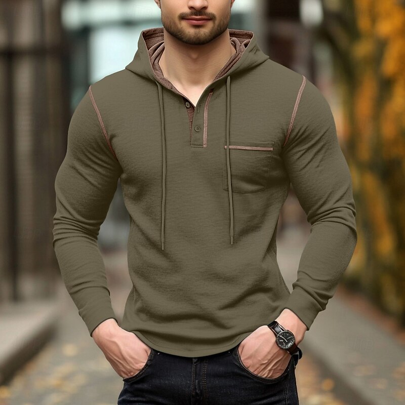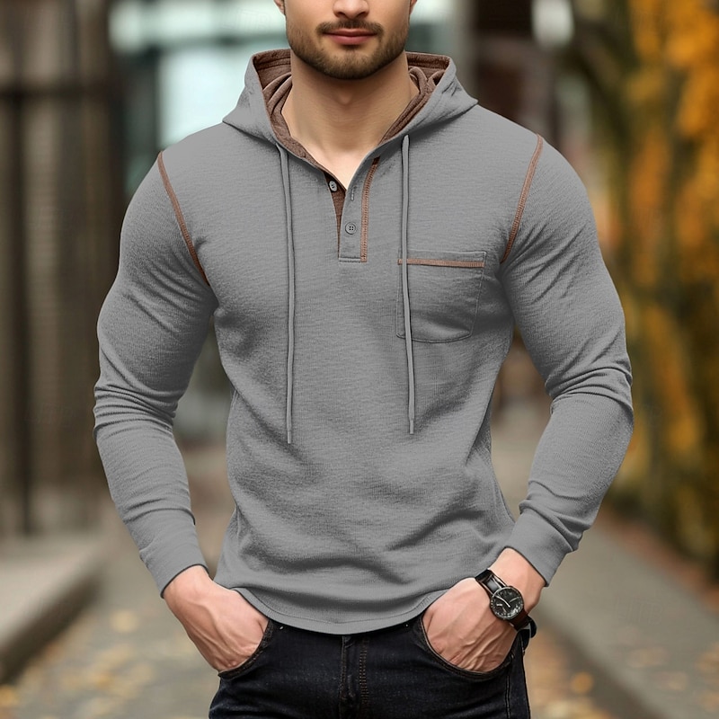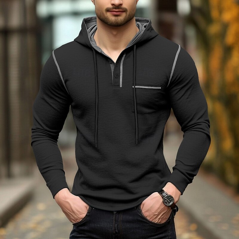 More information about Men's T Shirt Henley Hoodie Long Sleeve Hooded Henley Spring & Fall Solid Color Knitwear Daily Outdoor Pocket Outdoor Causal Casual Dark Grey Navy Black Top Tee for Men
